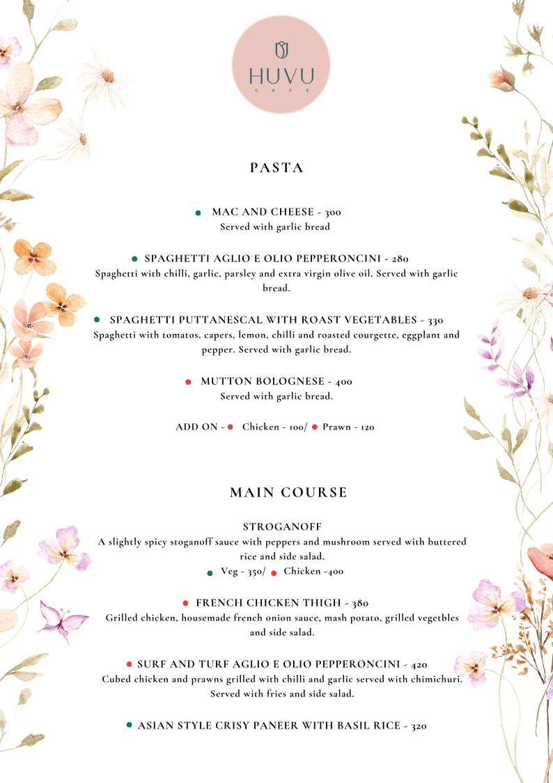 - Main Courses: Savor culinary delights like Stroganoff and French Chicken Thigh for a hearty meal.