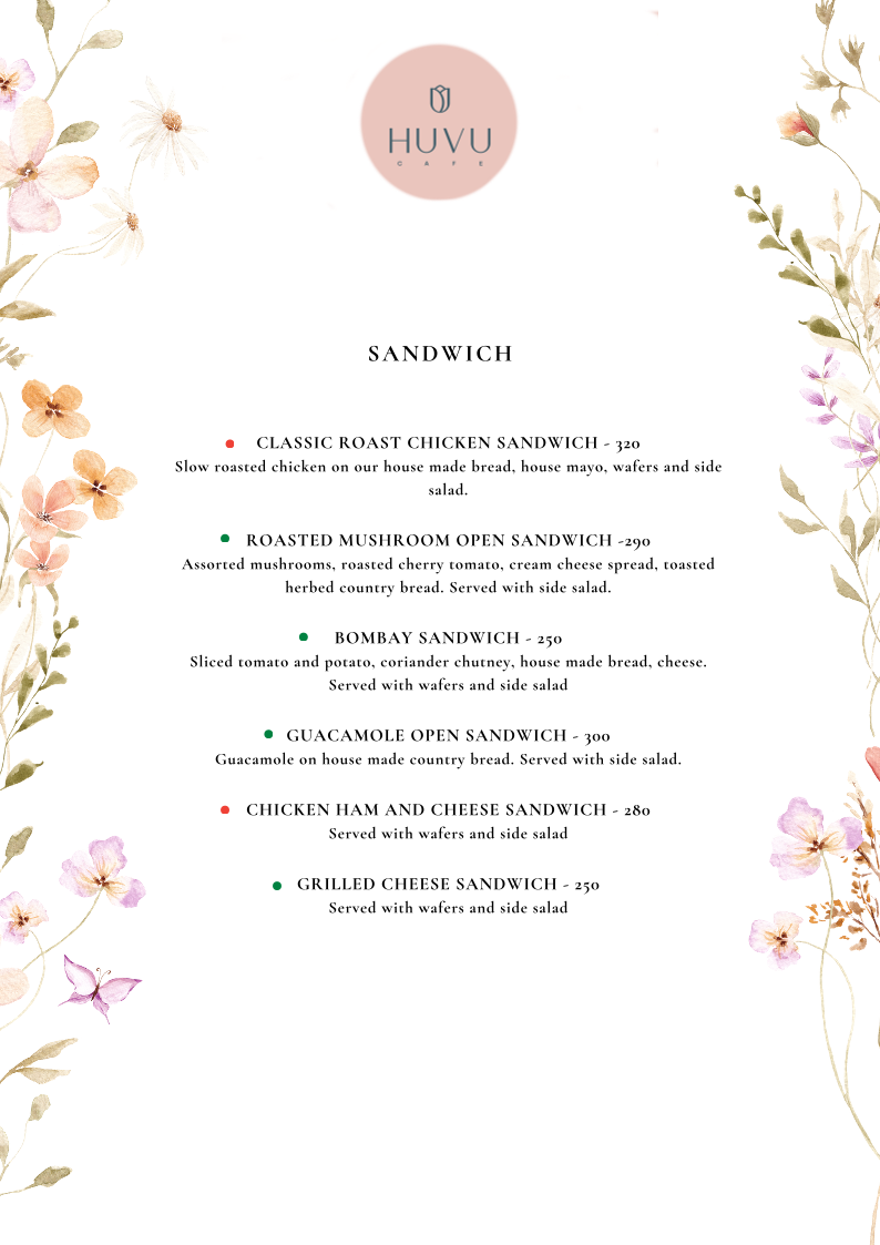 - Sandwiches: Explore a range of delicious options, from the Classic Roast Chicken Sandwich to the unique Guacamole Open Sandwich.